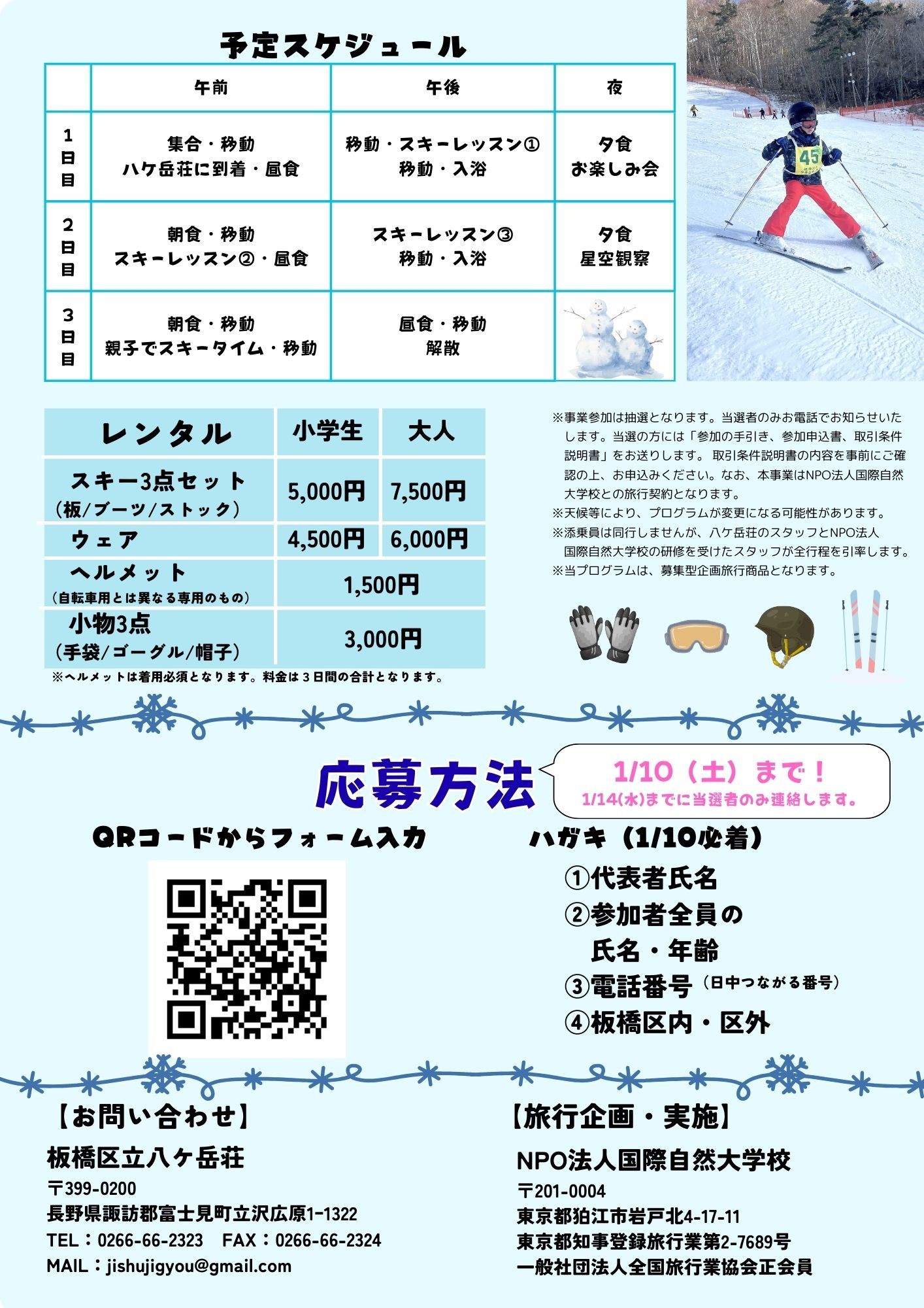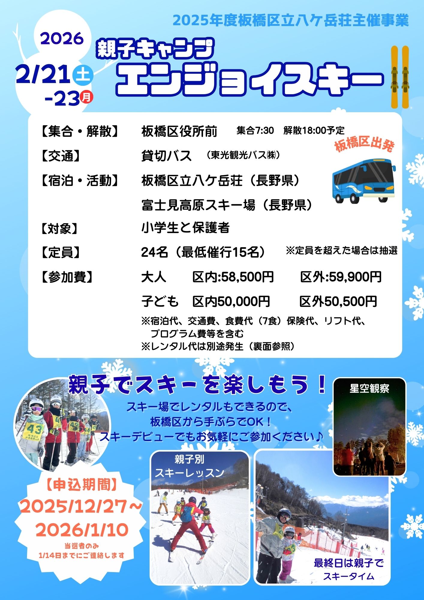 【内 容】スキーレッスン(親子別)、親子で滑るフリータイム、レクリエーション、星空観察など